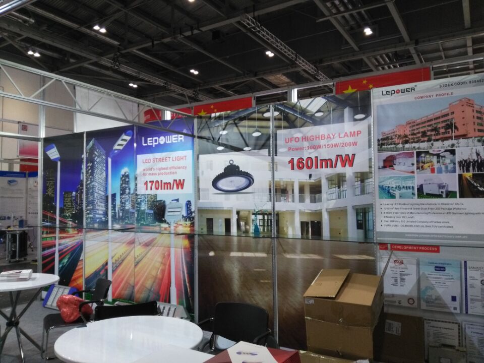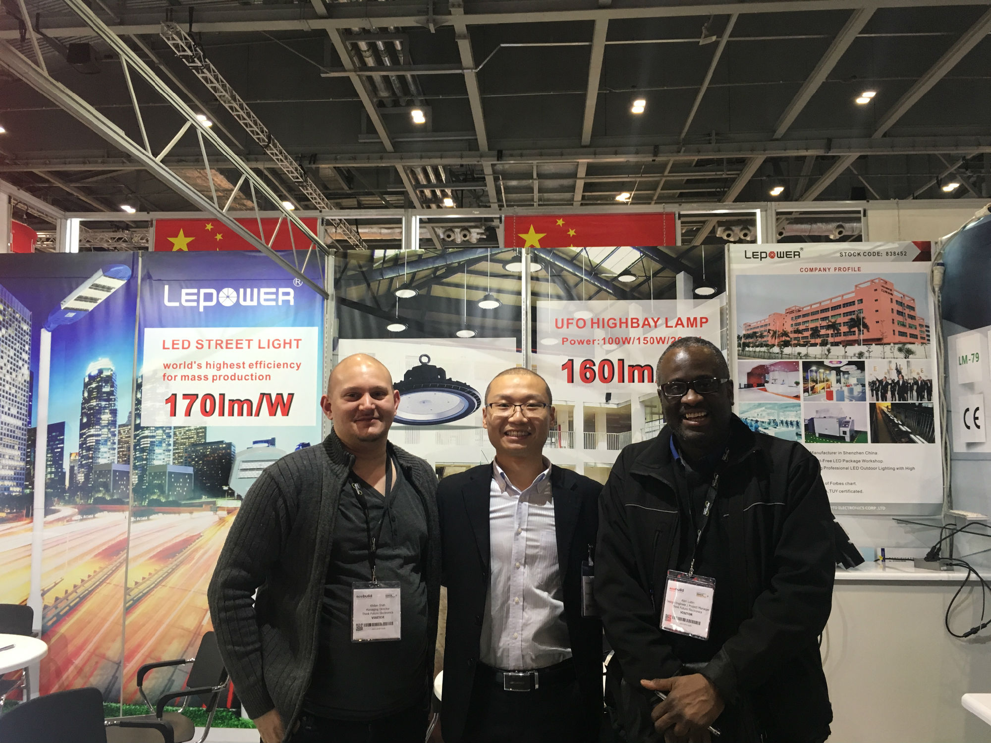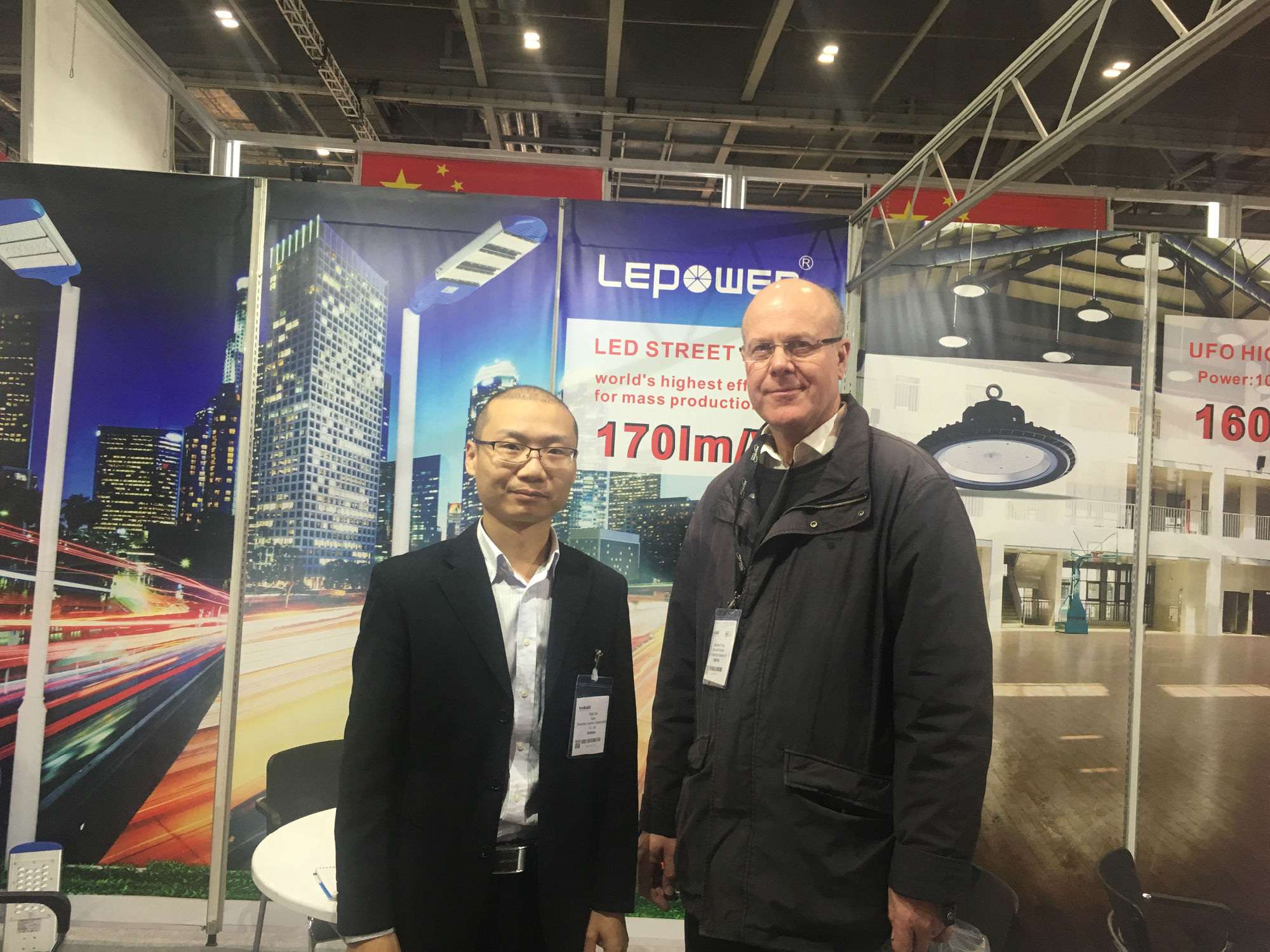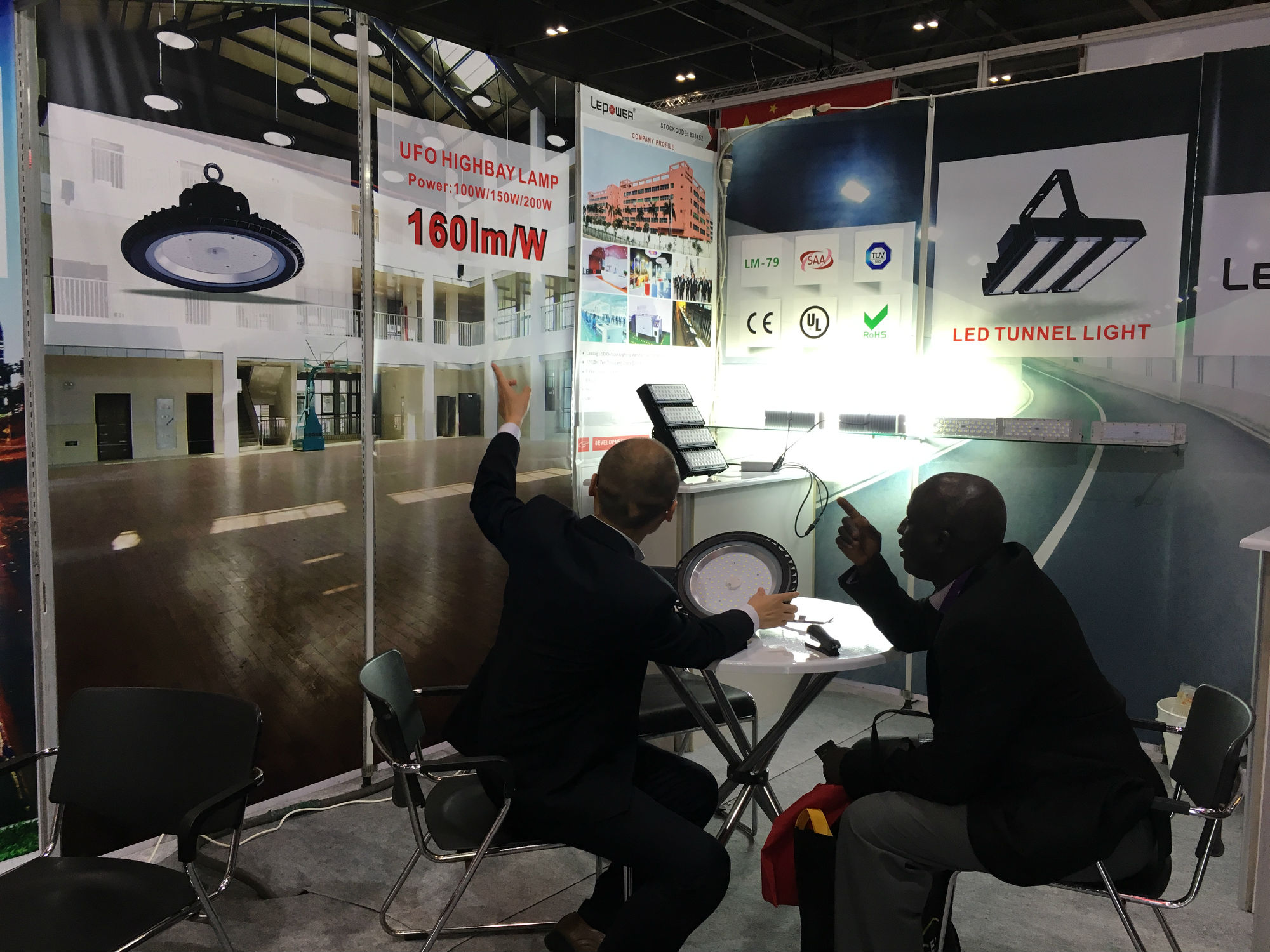 現場的銷售工程師正向客戶介紹光效高達160lm/w的UFO工礦燈,他豐富的專業知識和熱情耐心的服務也引來了不少國際友人的合影。