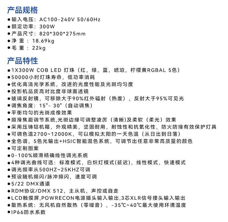 可以模擬太陽的一天色溫(從日出到日落)全色譜,5色光輸出+HSIC智能混色系統;