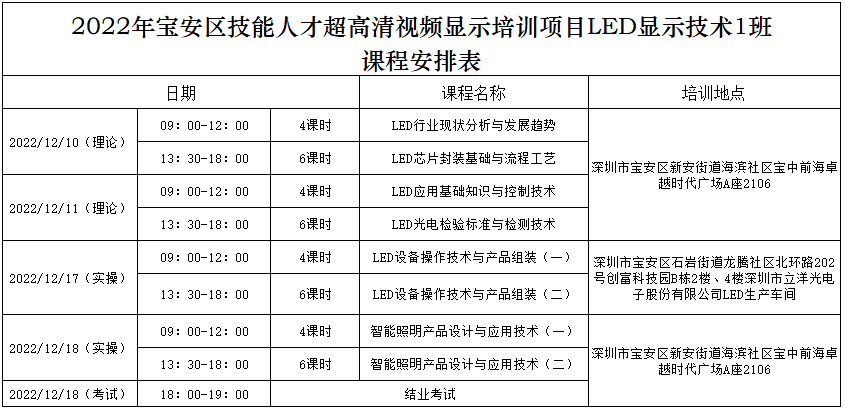 培訓時間為2022年12月10日、11日、17日、18日(共4天 )。其中12月17日全天的學習培訓基地為深圳市立洋光電子股份有限公司(深圳市寶安區(qū)石巖鎮(zhèn)北環(huán)路202號創(chuàng)富科技園B棟)。