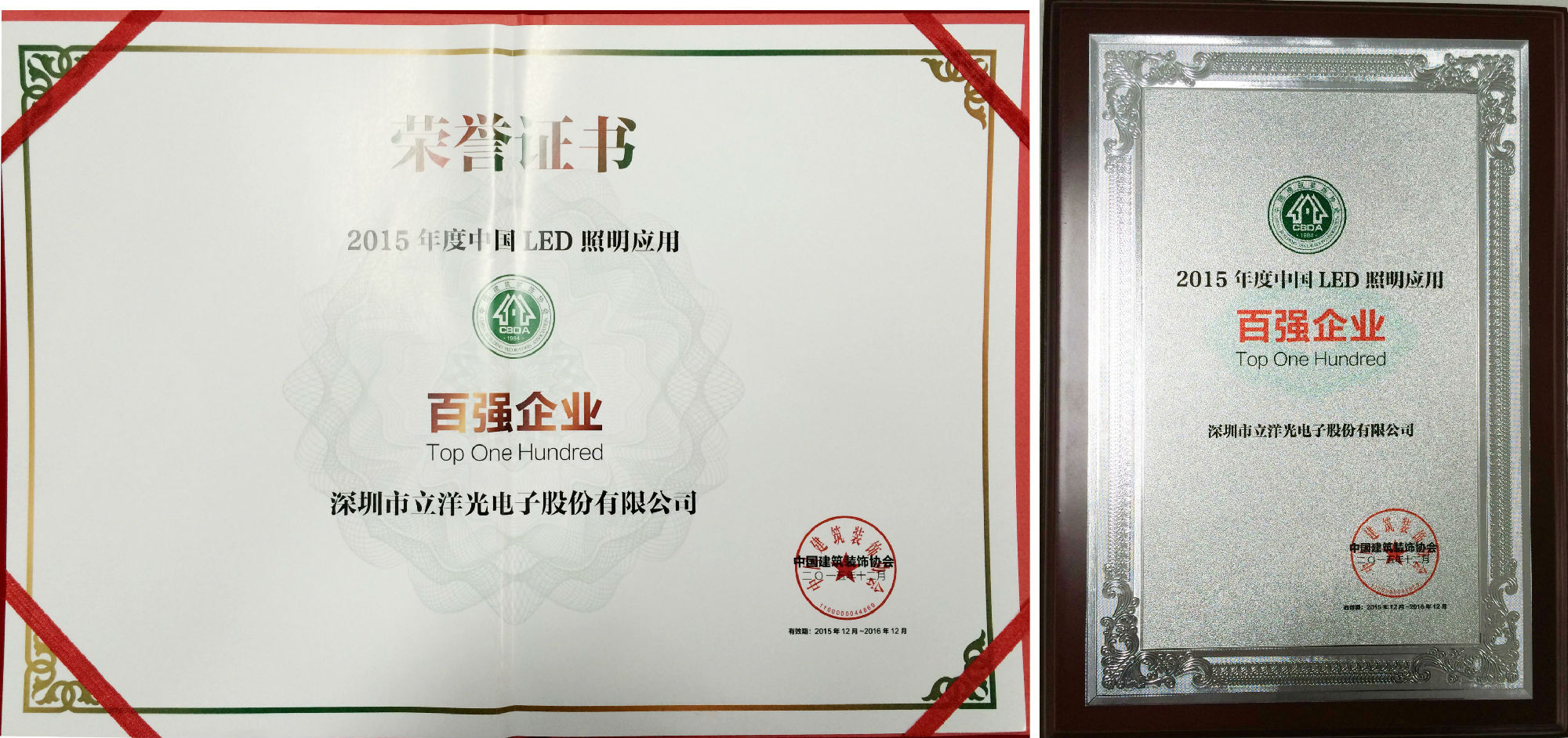 賀:立洋光電榮獲“2015中國(guó)LED照明應(yīng)用百?gòu)?qiáng)企業(yè)”!