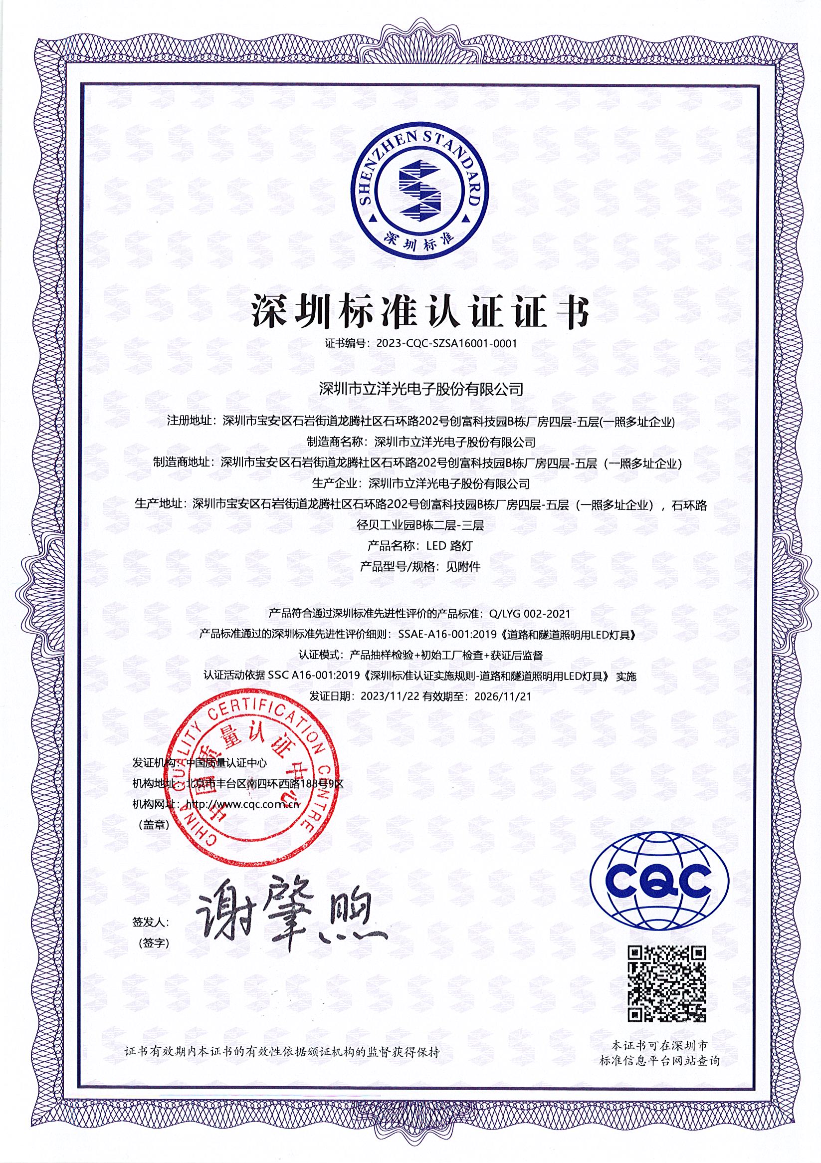 深圳標準認證是對產品性能和技術指標的一種權威性評估,代表了行業內的最高水平。立洋光電的L68路燈能夠獲得此項認證,表明公司在LED路燈領域的技術研發、產品創新以及質量管理等方面都達到了國際領先水平。
