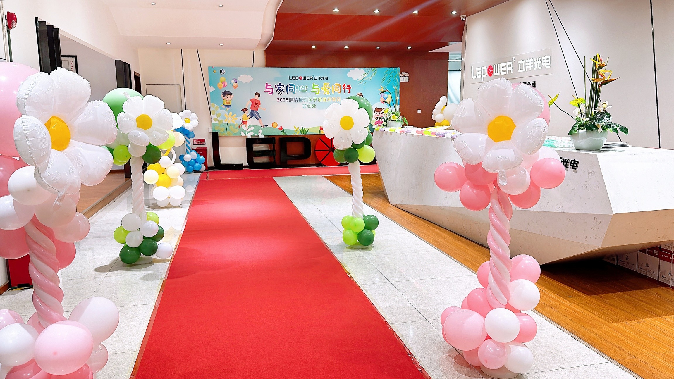 活動當天,公司前臺化身溫馨的“親子樂園”。入口處,主題海報與彩色氣球營造出童趣氛圍;簽到臺前,小朋友興奮地和自己爸爸媽媽在公司簽到墻簽到并合影留念。