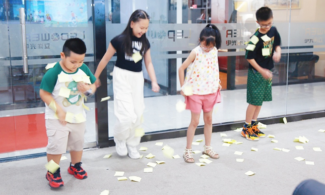 每位小朋友貼上便簽紙,隨著主持人的一聲“321開始!”,大家立刻扭動身體、瘋狂甩頭,甚至跳起“抖臀舞”,試圖甩掉背后的所有便簽紙,現場一片“噼里啪啦”的撕紙聲和歡笑聲,游戲PK下來,最終由“立洋活力王者”小組獲得獎品,并合影留念。