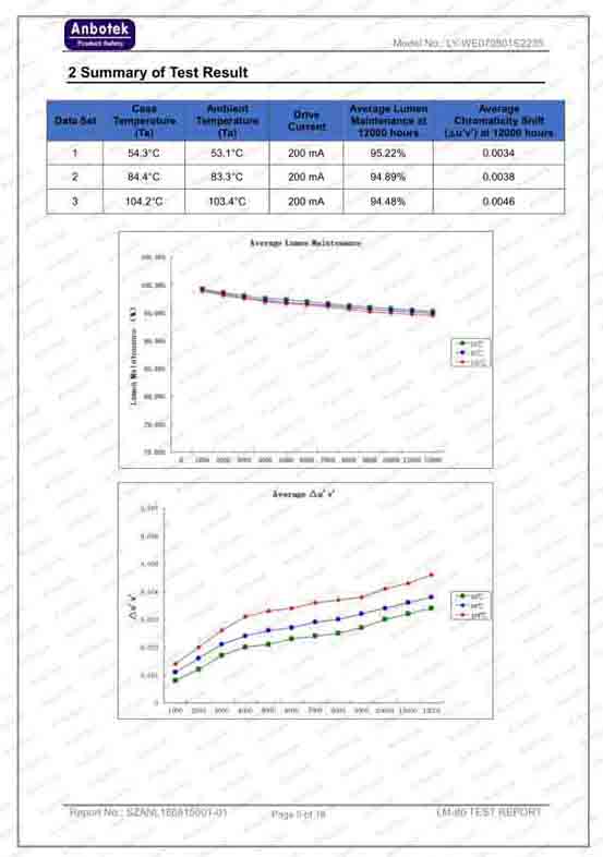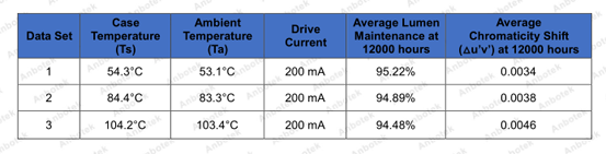 本次測試,立洋股份5050產(chǎn)品12000小時流明維持率分別為:54.3℃12000小時高達(dá)95.22%、84.4℃12000小時高達(dá)94.89%、104.2℃12000小時高達(dá)94.48%,由此可見立洋股份5050產(chǎn)品的超低光衰。依據(jù)TM-21壽命推算方法,在200mA驅(qū)動電流下,55℃、85℃、105℃這三組預(yù)設(shè)溫度推算L70壽命分別為115000小時、115000小時、101000小時,此測試結(jié)果表明立洋股份5050產(chǎn)品具有良好的使用壽命。