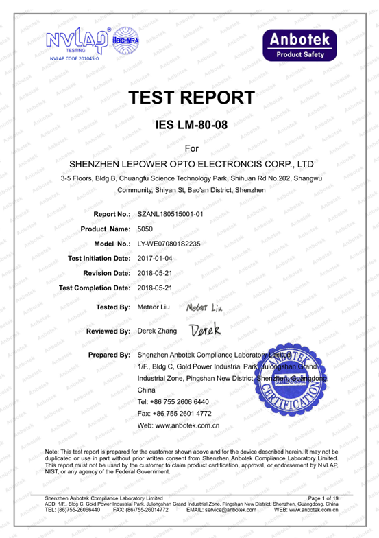 喜訊!立洋股份5050產(chǎn)品取得LM-80標(biāo)準(zhǔn)12000小時測試報告