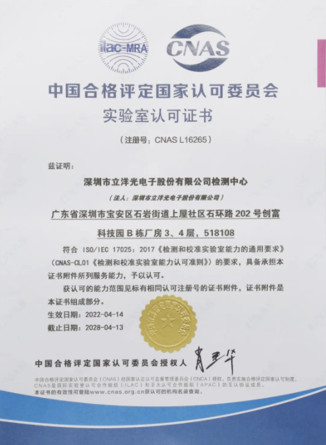 近日,深圳市立洋光電子股份有限公司檢測中心順利通過中國合格評定國家認可委員會的評審,正式獲得CNAS實驗室認可資格,成為CNAS認可的實驗室,注冊號:CNASL16265。