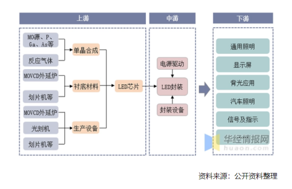 LED照明產(chǎn)業(yè)鏈較長(zhǎng),不同環(huán)節(jié)分工明確。上游主要包括單晶合成、襯底制作、芯片制作以及生產(chǎn)設(shè)備供應(yīng)四個(gè)環(huán)節(jié);中游為L(zhǎng)ED的封裝環(huán)節(jié);下游主要應(yīng)用于通用照明、顯示屏、背光應(yīng)用、汽車照明、信號(hào)指示等領(lǐng)域。