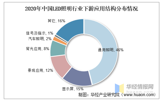 從LED照明應(yīng)用結(jié)構(gòu)情況來(lái)看,通用照明是LED照明行業(yè)最大的應(yīng)用領(lǐng)域,2020年市場(chǎng)占比達(dá)46%,其次為顯示屏和景觀照明,占比分別為15%和12%。