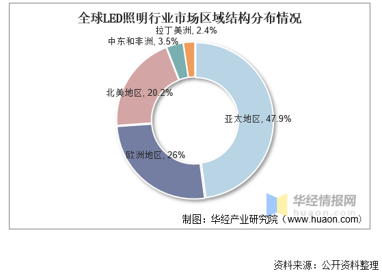 從市場(chǎng)區(qū)域分布情況來(lái)看,由于亞太、歐洲和北美等地區(qū)作為世界主要經(jīng)濟(jì)體,消費(fèi)能力強(qiáng),市場(chǎng)需求旺盛,占據(jù)了全球LED照明行業(yè)絕大部分的市場(chǎng)。其中亞太地區(qū)是全球最大的LED照明消費(fèi)市場(chǎng),占比達(dá)47.9%,其次為歐洲和北美地區(qū),占比分別為26%和20.2%。
