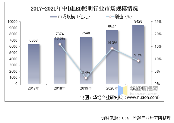 我國(guó)作為LED照明產(chǎn)品最大的生產(chǎn)制造國(guó),近年來(lái)產(chǎn)業(yè)規(guī)模迅速發(fā)展,加上在白熾燈替換需求的加持下,LED照明產(chǎn)品滲透率不斷提升,為行業(yè)規(guī)模的增長(zhǎng)提供了強(qiáng)勁動(dòng)力。據(jù)資料顯示,2021年我國(guó)LED照明行業(yè)市場(chǎng)規(guī)模達(dá)9428億元,同比增長(zhǎng)9.3%。