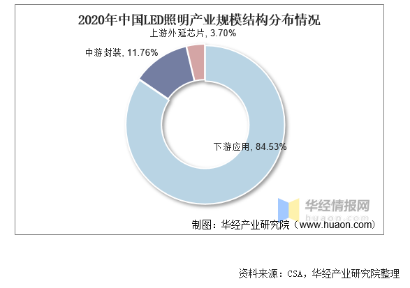 從產(chǎn)業(yè)規(guī)模結(jié)構(gòu)情況來(lái)看,2020年我國(guó)LED照明產(chǎn)業(yè)規(guī)模中,下游應(yīng)用占比達(dá)84.53%,中游封裝占比為11.76%,上游外延芯片占比為3.7%。
