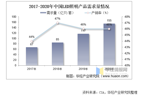 從需求量情況來(lái)看,近年來(lái)我國(guó)LED照明產(chǎn)品需求量呈上升趨勢(shì)。據(jù)資料顯示,2020年我國(guó)LED照明產(chǎn)品需求量達(dá)155億只/套,同比增長(zhǎng)32.5%,產(chǎn)銷量為46%。
