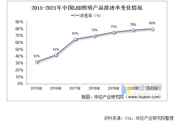 隨著我國(guó)LED照明行業(yè)的快速發(fā)展,在下游需求增長(zhǎng)的帶動(dòng)下,行業(yè)滲透率也隨之不斷提升。據(jù)資料顯示,2021年我國(guó)LED照明產(chǎn)品滲透率達(dá)80%,較上年增長(zhǎng)2%。