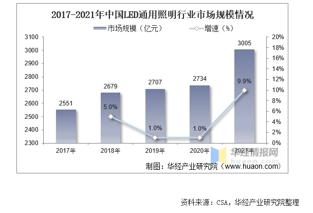 LED通用照明應(yīng)用是LED照明應(yīng)用市場(chǎng)的第一驅(qū)動(dòng)力,由于LED照明技術(shù)發(fā)展迅速,以及成本快速下降,已成為全球主流照明光源。近年來(lái),通過(guò)將智能控制模塊嵌入LED通用照明終端,形成了具有自動(dòng)控制、系統(tǒng)化控制等功能的智能照明創(chuàng)新領(lǐng)域,已成為L(zhǎng)ED通用照明市場(chǎng)的新增長(zhǎng)點(diǎn)。據(jù)資料顯示,2021年我國(guó)LED通用照明市場(chǎng)規(guī)模達(dá)3005億元,同比增長(zhǎng)9.9%。