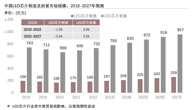 2018至2019年,中國LED芯片行業發展因中美貿易戰等外部環境風險,行業進入下行周期。基于國家利好政策、Mini/Micro-LED技術成熟等方面驅動,LED行業自2022年進入上升周期。