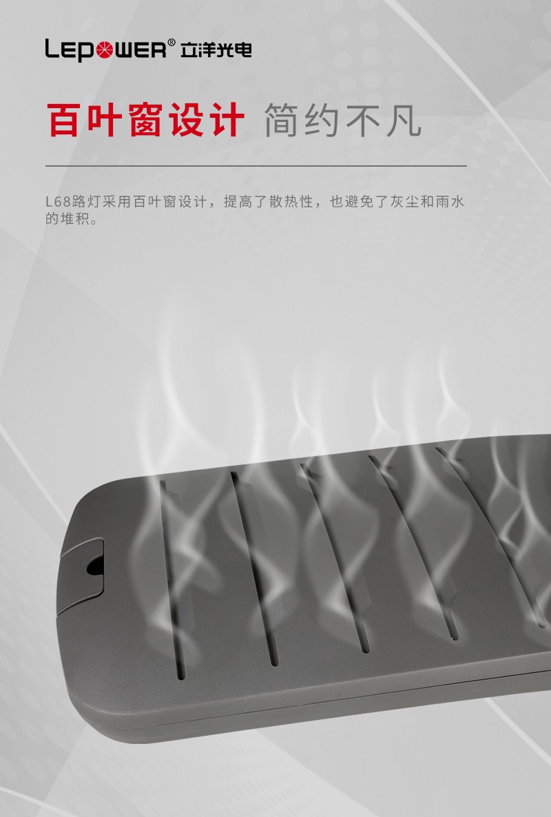 L68LED路燈采用百葉窗設(shè)計(jì),提高了散熱性,也避免了灰塵和雨水的堆積。