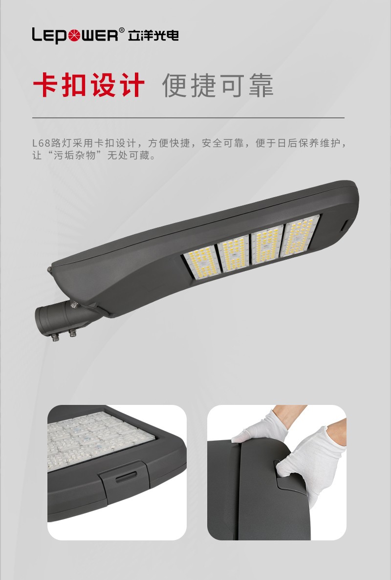 L68LED路燈采用卡扣設(shè)計(jì),方便快捷,安全可靠,便于日后保養(yǎng)維護(hù),讓“污垢雜物”無處可藏。