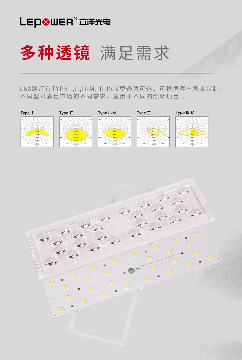 L68LED路燈有Type I,II,II-M,III,IV,V型透鏡可選,可根據(jù)客戶需求定制,不同型號(hào)滿足市場(chǎng)的不同需求,適用于不同的照明項(xiàng)目。