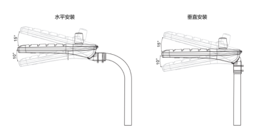 L68 LED路燈的安裝角度范圍在-10°~ 15°角度可調(diào),適用于不同安裝臂。