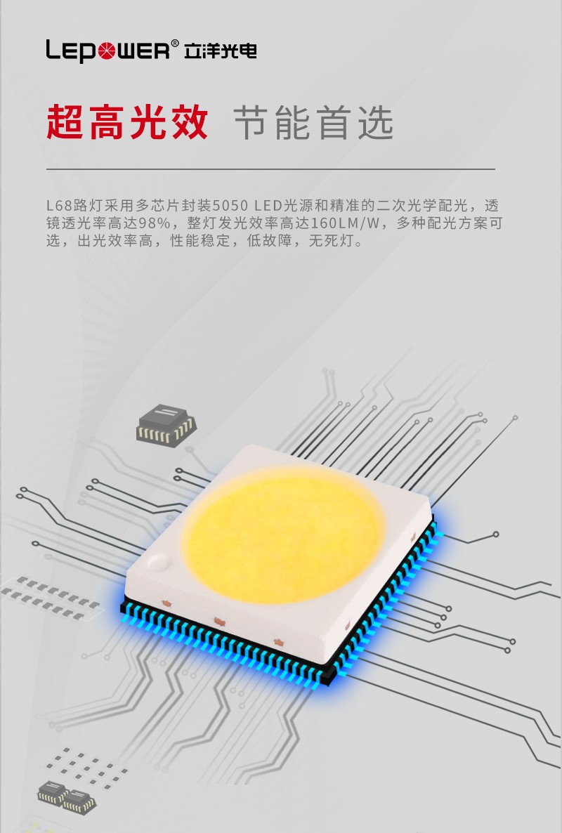 L68LED路燈采用多芯片封裝5050 LED光源和精準(zhǔn)的二次光學(xué)配光,透鏡透光率高達(dá)98%,整燈發(fā)光效率高達(dá)160lm/w,多種配光方案可選,出光效率高,性能穩(wěn)定,低故障,無死燈。