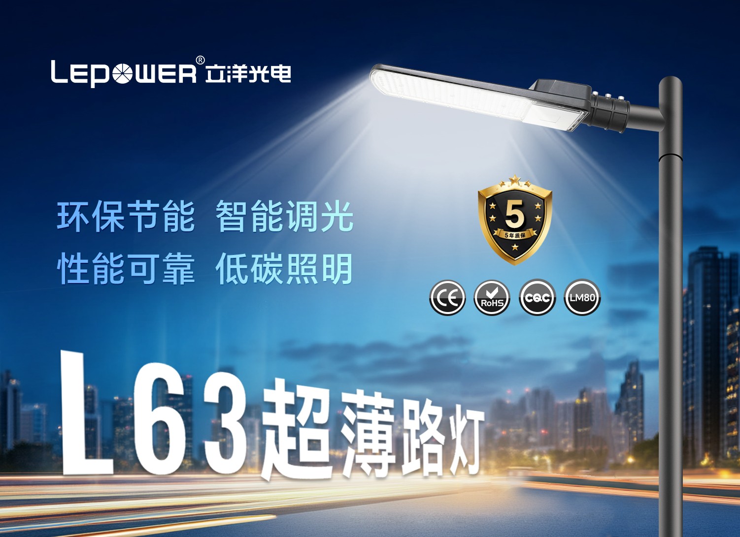 立洋光電LED路燈L63以高品質的材料、靈活的功率選擇、超薄的設計、卓越的光源性能以及智能化的照明控制,為城市道路照明提供了一種非常經濟高效的解決方案。不僅提升了城市的夜間形象,更在節能減排、智慧城市建設等方面發揮了重要作用,是未來城市照明的理想選擇。