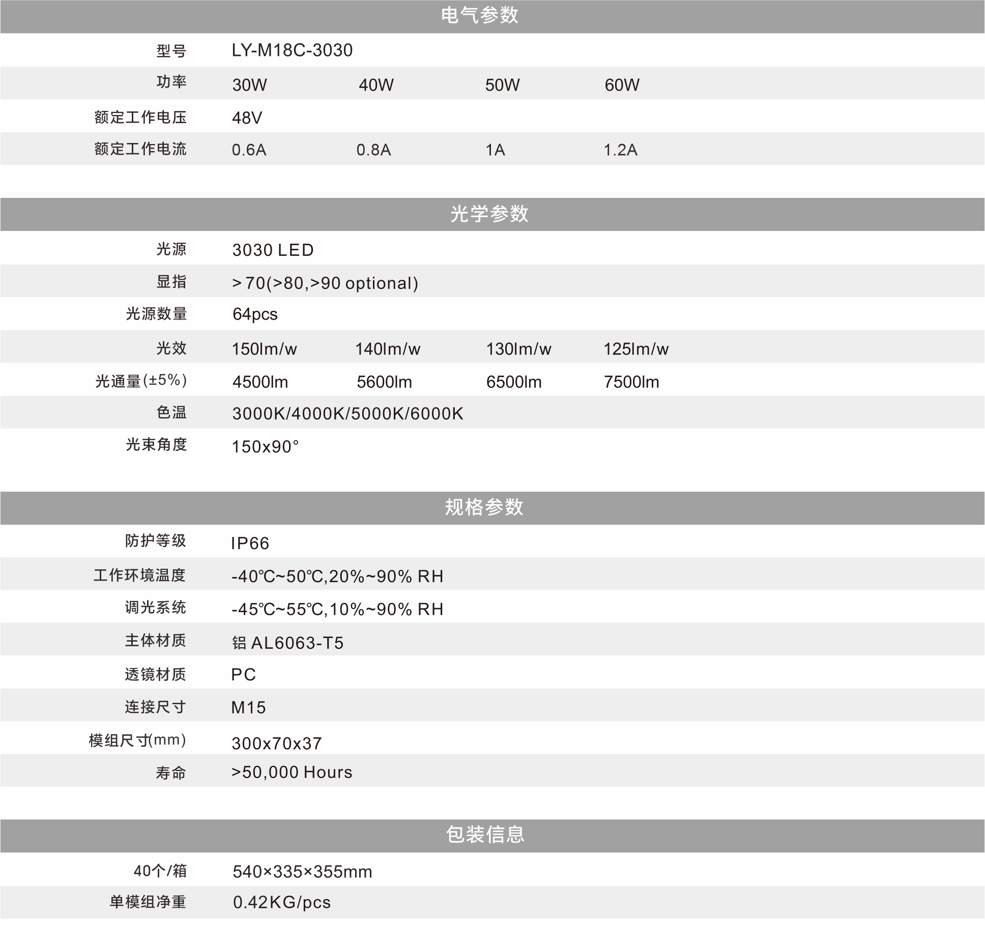 M18C模組采用CSA016標準結構尺寸,應用面廣,結構互換性強。LED光源采用多晶封裝,光效高,性能穩定,低光衰,高導熱擠出鋁合金和滿足流體力學的散熱技術,降低溫升,有效延長模組壽命,高光效的LED燈珠及高透光率的光學透鏡,系統損耗小,光效高。